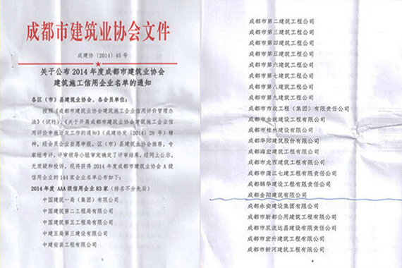 成都金陽(yáng)建筑有限公司組建于1986年,是房屋建筑工程施工總承包二級(jí)、市政公用工程施工總承包三級(jí)、鋼結(jié)構(gòu)工程專業(yè)承包二級(jí)、裝飾裝修工程專業(yè)承包三級(jí)、土石方工程專業(yè)承包三級(jí)資質(zhì)企業(yè)。公司自成立20多年來,先后承建了30米跨度100噸級(jí)行車車間和庫(kù)房,中外合資三星級(jí)賓館、商業(yè)大樓、醫(yī)院門診大樓、教學(xué)樓、公路、鐵路、橋梁和住宅樓等工程,公司還承建了土地整理、安置房建設(shè)、道路和橋涵等多個(gè)政府投資項(xiàng)目。累計(jì)施工面積逾1500萬㎡,工程合格率100%,優(yōu)良率達(dá)40%以上,具有較高的社會(huì)聲譽(yù)。公司先后獲得省、市、縣各級(jí)授予的“先進(jìn)企業(yè)”“先進(jìn)集體”“優(yōu)勝企業(yè)”“明星企業(yè)” “重合同守信用企業(yè)”“納稅先進(jìn)企業(yè)”“安全生產(chǎn)先進(jìn)單位”等若干榮譽(yù),2014年11月,公司再次榮獲成都市建筑業(yè)協(xié)會(huì)“2014年度AAA級(jí)信用企業(yè)”榮譽(yù)。(圖為文件部分掃描件)